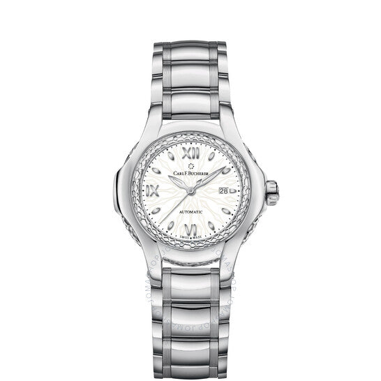 علبة من الفولاذ المقاوم للصدأ فضية اللون مع سوار فضي اللون. إطار ثابت مرصع بالألماس فضي اللون. ميناء أبيض بعقارب فضية اللون ومؤشرات ساعات بأرقام رومانية. نوع الميناء: تناظري. عرض التاريخ عند موضع الساعة 3. حركة أوتوماتيكية من كارل إف. بوخرر، كاليبر CFB 1963، مع احتياطي طاقة لمدة 38 ساعة. كريستال ياقوت مقاوم للخدش. تاج قابل للسحب/الدفع. غطاء خلفي شفاف هيكلي. هيكل دائري الشكل، مقاسه 34 مم، سُمكه 9.65 مم. مقاومة للماء حتى عمق 30 مترًا / 100 قدم. الوظائف: التاريخ، الساعة، الدقيقة، الثانية. سلسلة باثوس ديفا. تصميم ساعة فاخر. علامة الساعة: صناعة سويسرية. تنوعات المنتج: 366.100.3. ساعة كارل إف. بوخرر باثوس ديفا أوتوماتيكية نسائية 00.10580.08.25.21.01.