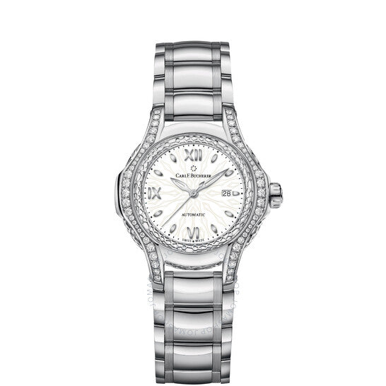 علبة من الفولاذ المقاوم للصدأ فضية اللون مع سوار فضي اللون. إطار ثابت مرصع بالألماس فضي اللون. ميناء أبيض بعقارب فضية اللون وعلامات ساعات بأرقام رومانية. علامات دقائق حول الحافة الخارجية. نوع الميناء: تناظري. عرض التاريخ عند موضع الساعة 3. حركة أوتوماتيكية من كارل إف. بوخرر، كاليبر CFB 1963، مع احتياطي طاقة لمدة 38 ساعة. كريستال ياقوت مقاوم للخدش. تاج قابل للسحب/الدفع. غطاء خلفي شفاف هيكلي. هيكل دائري الشكل، مقاسه: 34 مم، سُمكه: 9.65 مم. مقاومة للماء حتى عمق 30 مترًا / 100 قدم. الوظائف: التاريخ، الساعة، الدقيقة، الثانية. معلومات إضافية: هيكل مرصع بـ 54 ماسة. سلسلة باثوس ديفا. تصميم ساعة فاخرة. علامة الساعة: صناعة سويسرية. تنوعات المنتج: 366.120.7. ساعة كارل اف بوخرير باثوس ديفا أوتوماتيكية للسيدات 00.10580.08.25.31.01.