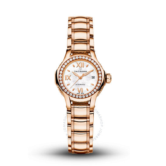 علبة وسوار من الذهب الوردي عيار 18 قيراطًا. إطار مرصع بالألماس. ميناء من عرق اللؤلؤ مع عقارب من الذهب الوردي ومؤشرات ساعات بأرقام رومانية. نوع الميناء: تناظري. عرض التاريخ عند موضع الساعة 3. حركة أوتوماتيكية من كارل إف. بوخرر كاليبر CFB 1969 مع احتياطي طاقة لمدة 38 ساعة. زجاج من الياقوت المقاوم للخدش. غطاء خلفي من الياقوت. شكل العلبة دائري، مقاسها 26.5 مم. مشبك قابل للطي. مقاومة للماء حتى عمق 30 مترًا / 100 قدم. الوظائف: التاريخ، الساعة، الدقيقة، الثانية. سلسلة باثوس كوين. تصميم ساعة فاخرة. علامة الساعة: صناعة سويسرية. ساعة كارل إف. بوخرر باثوس كوين أوتوماتيكية نسائية مرصعة بالألماس 00.10551.03.75.31.