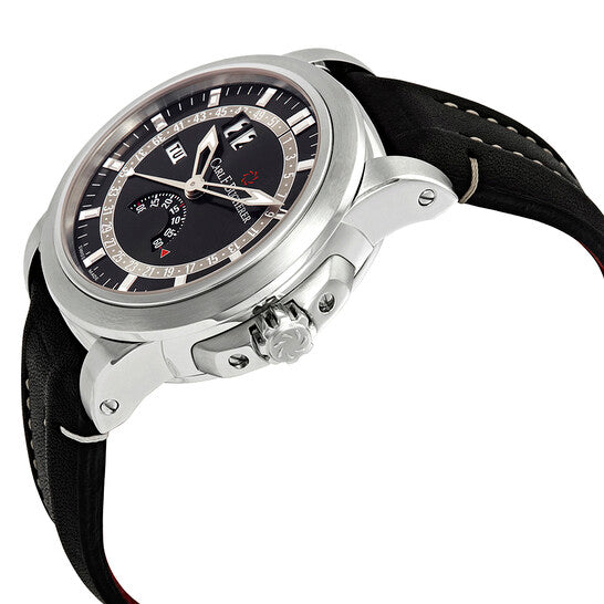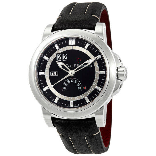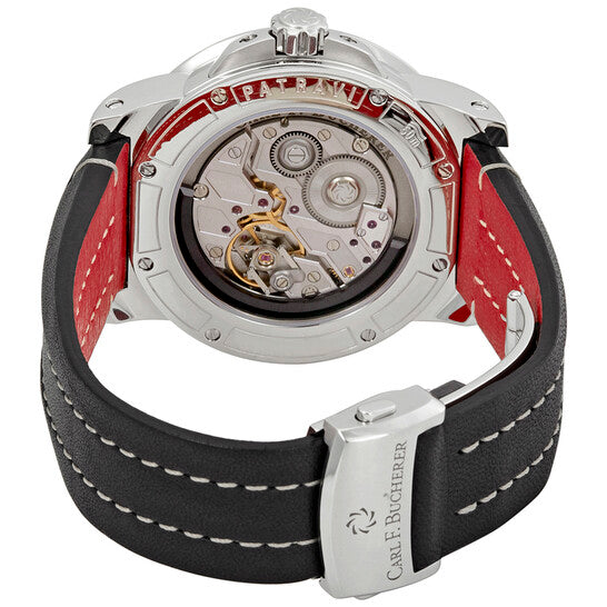 علبة من الفولاذ المقاوم للصدأ فضية اللون مع سوار جلدي أسود. إطار ثابت. ميناء أسود بعقارب فضية اللون وعلامات ساعات. نوع الميناء: تناظري. عرض التاريخ عند موضع الساعة 11. حركة أوتوماتيكية من كارل إف. بوخرر كاليبر CFB A1004 مع احتياطي طاقة يصل إلى 55 ساعة. زجاج من الياقوت المقاوم للخدش. تاج لولبي. شكل العلبة دائري، مقاسها: 42.6 مم، سمكها: 12.85 مم. مقاومة للماء حتى عمق 50 مترًا / 165 قدمًا. الوظائف: التاريخ، الساعات، الدقائق، الثواني، مؤشر الأسبوع. علامة الساعة: صناعة سويسرية. ساعة كارل إف. بوخرر باترافي أوتوماتيكية للرجال بمينا أسود، 00.10629.08.33.01.