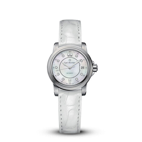 علبة من الفولاذ المقاوم للصدأ مع سوار من جلد التمساح الأبيض. إطار ثابت. ميناء أبيض من عرق اللؤلؤ مع عقارب فضية اللون وعلامات ساعات مرصعة بالألماس. علامات دقائق حول الحافة الخارجية. نوع الميناء: تناظري. عقارب وعلامات مضيئة. عرض التاريخ عند موضع الساعة 3. حركة أوتوماتيكية من كارل إف. بوخرر، عيار CFB 1963، باحتياطي طاقة يبلغ حوالي 38 ساعة. زجاج من الياقوت المقاوم للخدش. تاج لولبي. غطاء خلفي شفاف هيكلي. حجم العلبة: 27 مم. سُمكها: 9.05 مم. شكلها دائري. مقاومة للماء حتى عمق 50 مترًا / 165 قدمًا. الوظائف: التاريخ، الساعة، الدقيقة، الثانية. تصميم ساعة فاخرة. علامة الساعة: صناعة سويسرية. تنوعات المنتج: 366.409.1. ساعة كارل إف. بوخرر باترافي أوتوماتيكية نسائية، 00.10621.08.77.01.