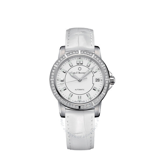 علبة من الفولاذ المقاوم للصدأ فضية اللون مع سوار جلدي أبيض. إطار ثابت فضي اللون مرصع بالألماس. ميناء أبيض بعقارب فضية اللون وعلامات ساعات. علامات دقائق حول الحافة الخارجية. نوع الميناء: تناظري. عقارب وعلامات مضيئة. عرض التاريخ عند موضع الساعة 3. حركة أوتوماتيكية من كارل إف. بوخرر، كاليبر CFB 1950، تحتوي على 26 جوهرة، تنبض بمعدل 28800 ذبذبة في الساعة، ولديها احتياطي طاقة يدوم حوالي 38 ساعة. زجاج من الياقوت المقاوم للخدش. تاج لولبي. هيكل دائري، مقاسه: 34 مم، سمكه: 9.5 مم. مقاومة للماء حتى عمق 50 مترًا / 165 قدمًا. الوظائف: التاريخ، الساعة، الدقيقة، الثانية. سلسلة باترافي. تصميم ساعة فاخرة. علامة الساعة: صناعة سويسرية. تنوعات المنتج: 366.422.8. ساعة كارل اف بوخرير باترافي أوتوماتيكية للسيدات 00.10622.08.23.11.