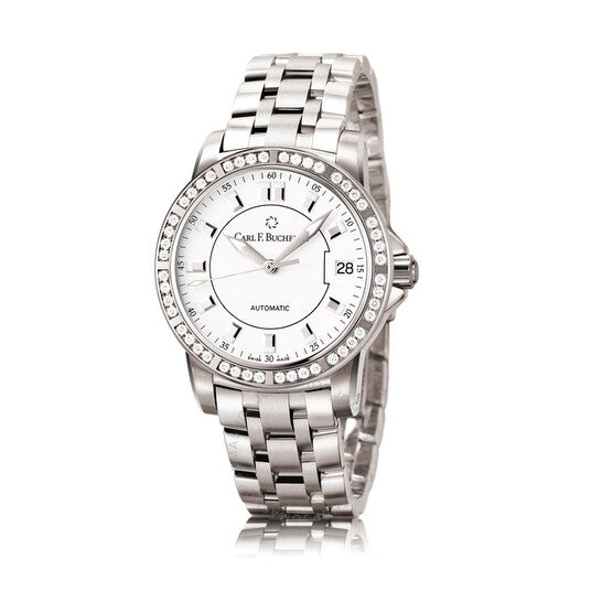 علبة من الفولاذ المقاوم للصدأ فضية اللون مع سوار فضي اللون. إطار ثابت مرصع بالألماس فضي اللون. ميناء أبيض مع عقارب فضية اللون وعلامات ساعات. علامات دقائق حول الحافة الخارجية. نوع الميناء: تناظري. عقارب مضيئة. عرض التاريخ عند موضع الساعة 3. حركة أوتوماتيكية من كارل إف. بوخرر كاليبر CFB 1963 مع احتياطي طاقة لمدة 38 ساعة. زجاج ياقوت مقاوم للخدش. تاج قابل للسحب/الدفع. شكل العلبة دائري، مقاسها: 34 مم. إبزيم قابل للطي بزر ضغط. مقاومة للماء حتى عمق 50 مترًا / 165 قدمًا. الوظائف: التاريخ، الساعة، الدقيقة، الثانية. سلسلة باترافي. تصميم ساعة فاخرة. علامة الساعة: صناعة سويسرية. تنوعات المنتج: 366.465.9. ساعة كارل إف. بوخرر باترافي أوتوماتيكية نسائية 00.10622.08.23.31.