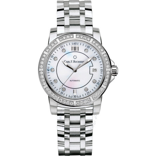 علبة من الفولاذ المقاوم للصدأ فضية اللون مع سوار فضي اللون. إطار ثابت مرصع بالألماس فضي اللون. ميناء أبيض من عرق اللؤلؤ مع عقارب وعلامات ساعات فضية اللون. علامات دقائق حول الحافة الخارجية. نوع الميناء: تناظري. عقارب وعلامات مضيئة. عرض التاريخ عند موضع الساعة 3. حركة أوتوماتيكية من كارل إف. بوخرر، كاليبر CFB 1950، تحتوي على 26 جوهرة، تنبض بمعدل 28800 ذبذبة في الساعة، ولديها احتياطي طاقة يدوم حوالي 38 ساعة. زجاج من الياقوت المقاوم للخدش. تاج قابل للسحب/الدفع. هيكل دائري الشكل، مقاسه 34 مم. مقاومة للماء حتى عمق 50 مترًا / 165 قدمًا. الوظائف: التاريخ، الساعة، الدقيقة، الثانية. سلسلة باترافي. تصميم ساعة فاخرة. علامة الساعة: صناعة سويسرية. تنوعات المنتج: 366.466.0. ساعة كارل اف بوخرير باترافي أوتوماتيكية للسيدات 00.10622.08.77.31.