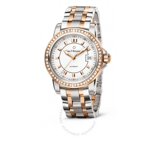 علبة من الذهب الوردي عيار 18 قيراطًا والفولاذ المقاوم للصدأ، بسوار ثنائي اللون (فضي وذهبي وردي). إطار ثابت من الذهب الوردي عيار 18 قيراطًا مرصع بالألماس. ميناء أبيض مع عقارب وعلامات ساعات باللون الذهبي الوردي. علامات دقائق حول الحافة الخارجية. نوع الميناء: تناظري. عقارب وعلامات مضيئة. عرض التاريخ عند موضع الساعة 3. حركة أوتوماتيكية من كارل إف. بوخرر كاليبر CFB 1950، تحتوي على 26 جوهرة، تنبض بمعدل 28800 ذبذبة في الساعة، ولديها احتياطي طاقة لمدة 38 ساعة تقريبًا. زجاج من الياقوت المقاوم للخدش. تاج لولبي. غطاء خلفي شفاف هيكلي. هيكل دائري الشكل، مقاس الهيكل: 38 مم. مقاومة للماء حتى عمق 50 مترًا / 165 قدمًا. الوظائف: التاريخ، الساعة، الدقيقة، الثانية. سلسلة باترافي. طراز ساعة فاخرة. ملصق الساعة: صناعة سويسرية. اختلافات المنتج: ١٦٦.٤٢٠.٠. ساعة كارل إف. بوخرير باترافي الأوتوماتيكية للرجال ٠٠.١٠٦١٧.٠٧.٢٣.٣١.