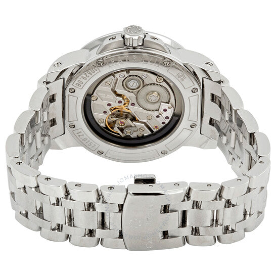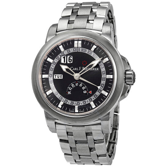 علبة فضية اللون من الفولاذ المقاوم للصدأ مع سوار فضي اللون. إطار ثابت من الفولاذ المقاوم للصدأ. ميناء أسود بعقارب فضية اللون وعلامات ساعات. نوع الميناء: تناظري. عرض التاريخ عند موضع الساعة 11. حركة أوتوماتيكية من كارل إف. بوخرر كاليبر CFB A1004 مع احتياطي طاقة يصل إلى 55 ساعة. زجاج ياقوتي مقاوم للخدش. تاج لولبي. علبة دائرية الشكل، مقاسها: 42.6 مم، سُمكها: 12.85 مم. مقاومة للماء حتى عمق 50 مترًا / 165 قدمًا. الوظائف: التاريخ، الساعات، الدقائق، الثواني، مؤشر الأسبوع. علامة الساعة: صناعة سويسرية. ساعة كارل إف. بوخرر باترافي كاليندر أوتوماتيكية للرجال من الفولاذ المقاوم للصدأ، 00.10629.08.33.21.