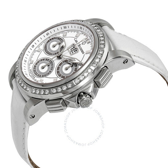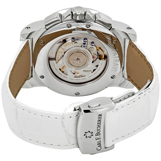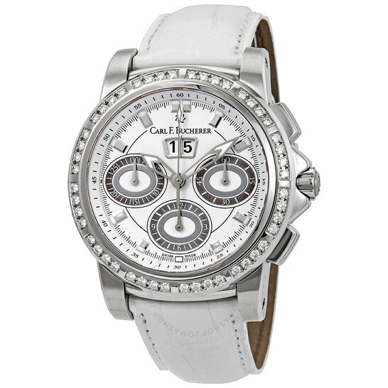 علبة من الفولاذ المقاوم للصدأ مع سوار جلدي أبيض. إطار ثابت من الفولاذ المقاوم للصدأ مرصع بالألماس. ميناء أبيض بعقارب ومؤشرات ساعات فضية مضيئة. مؤشرات دقائق حول الحافة الخارجية. نوع الميناء: تناظري. عقارب ومؤشرات مضيئة. عرض التاريخ أسفل موضع الساعة ١٢. كرونوغراف - ثلاثة موانئ فرعية تعرض: ٦٠ ثانية، ٣٠ دقيقة، و١٢ ساعة. حركة أوتوماتيكية من كارل إف. بوخرر، عيار CFB ١٩٥٦، مع احتياطي طاقة ٤٢ ساعة. زجاج ياقوت مقاوم للخدش. تاج لولبي. غطاء خلفي شفاف. شكل دائري. حجم العلبة: ٤٠ مم. سمكها: ١٣.٥ مم. عرض السوار: ٢٠ مم. مشبك قابل للطي. مقاومة للماء حتى عمق ٥٠ مترًا / ١٦٥ قدمًا. الوظائف: كرونوغراف، تاريخ، ساعة، دقيقة، ثانية. تصميم ساعة فاخرة. علامة الساعة: صناعة سويسرية. تنوعات المنتج: ١٦٦.٣٤٦.٧. ساعة كارل اف بوخرير باترافي كرونوغراف أوتوماتيكية مرصعة بالألماس للسيدات 00.10611.08.23.12.