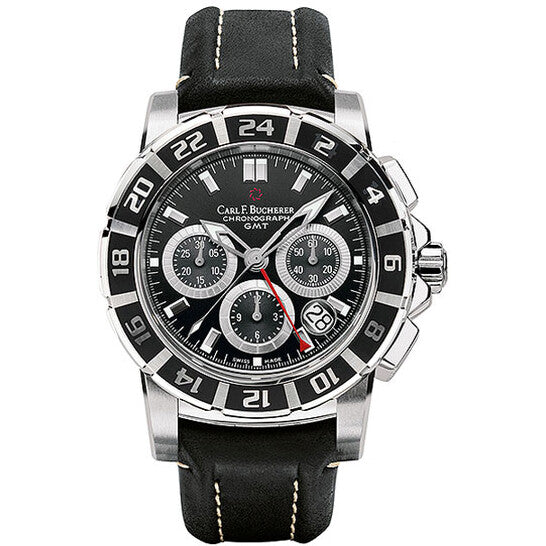 علبة من الفولاذ المقاوم للصدأ مع سوار أسود من جلد العجل. إطار دوار أحادي الاتجاه فضي اللون ومطلي باللون الأسود يعرض علامات ٢٤ ساعة. ميناء أسود بعقارب ومؤشرات ساعات فضية مضيئة. علامات دقائق حول الحافة الخارجية. نوع الميناء: تناظري. عقارب ومؤشرات مضيئة. عرض التاريخ بين موضعي الساعة الرابعة والخامسة. كرونوغراف - ثلاثة أقراص فرعية تعرض: ٦٠ ثانية، ٣٠ دقيقة، و١٢ ساعة. حركة أوتوماتيكية من كارل إف. بوخرر، عيار CFB 1901.1، مبنية على ETA 2894، تحتوي على ٣٩ جوهرة، تنبض بتردد ٢٨٨٠٠ ذبذبة في الساعة، ولديها احتياطي طاقة لمدة ٤٢ ساعة تقريبًا. زجاج ياقوت مقاوم للخدش. تاج قابل للسحب/الدفع. غطاء خلفي صلب. شكل دائري. حجم الهيكل: ٤٢ مم. سمك الهيكل: ١٢ مم. عرض السوار: ١٨ مم. مشبك قابل للطي. مقاومة للماء حتى عمق ٥٠ مترًا / ١٦٥ قدمًا. الوظائف: كرونوغراف، تاريخ، توقيت غرينتش، منطقة زمنية ثانية، ساعات، دقائق، ثوانٍ صغيرة، كرونومتر. سلسلة باترافي. تصميم ساعة فاخر. علامة الساعة: صناعة سويسرية. رقم المنتج: ١٦٦.١٧٢.٣. ساعة كارل إف. بوخرير باترافي كرونوغراف أوتوماتيكية للرجال ٠٠.١٠٦١٨.١٣.٣٣.٠١.