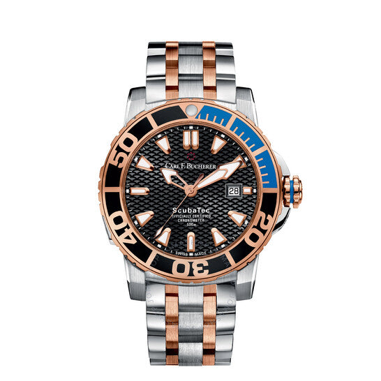 علبة من الفولاذ المقاوم للصدأ بسوار ثنائي اللون (فضي وذهبي وردي) من الفولاذ المقاوم للصدأ والذهب الوردي عيار 18 قيراطًا. إطار دوار أحادي الاتجاه من السيراميك الأسود والأزرق (باتمان). ميناء أسود مع عقارب وعلامات ساعات ذهبية وردية اللون. علامات دقائق حول الحافة الخارجية. نوع الميناء: تناظري. عقارب وعلامات مضيئة. عرض التاريخ عند موضع الساعة 3. حركة أوتوماتيكية كارل إف. بوخرر كاليبر CFB 1950.1 مع احتياطي طاقة لمدة 38 ساعة. زجاج ياقوت مقاوم للخدش. تاج لولبي. شكل العلبة دائري، مقاسها: 44.6 مم، سمكها: 13.45 مم. مقاومة للماء حتى عمق 500 متر / 1650 قدمًا. الوظائف: التاريخ، الساعة، الدقيقة، الثانية، الكرونومتر. تصميم ساعة فاخرة. علامة الساعة: صناعة سويسرية. تنوعات المنتج: 166.268.0. ساعة كارل اف بوخرير باترافي سكوباتيك أوتوماتيكية للرجال 00.10632.24.33.21.
