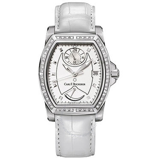 علبة من الفولاذ المقاوم للصدأ فضية اللون مع سوار جلدي أبيض. إطار ثابت فضي اللون مرصع بالألماس. ميناء أبيض مع عقارب وعلامات ساعات فضية اللون. علامات دقائق حول الحافة الخارجية. نوع الميناء: تناظري. عقارب وعلامات مضيئة. عرض التاريخ عند موضع الساعة 3. ميناءان فرعيان لعرض احتياطي الطاقة لمدة 24 ساعة. حركة أوتوماتيكية من كارل إف. بوخرر كاليبر CFB 1953 باحتياطي طاقة لمدة 42 ساعة. زجاج من الياقوت المقاوم للخدش. شكل العلبة: تونيو. حجم العلبة: 39 مم × 36 مم. مقاومة للماء حتى عمق 50 مترًا / 165 قدمًا. الوظائف: توقيت غرينتش، منطقة زمنية ثانية، التاريخ، الساعات، الدقائق، الثواني، مؤشر احتياطي الطاقة. تصميم ساعة فاخرة. علامة الساعة: صناعة سويسرية. تنوعات المنتج: 166.136.9. ساعة كارل إف. بوخرر باترافي T-24 أوتوماتيكية نسائية 00.10612.08.23.11.