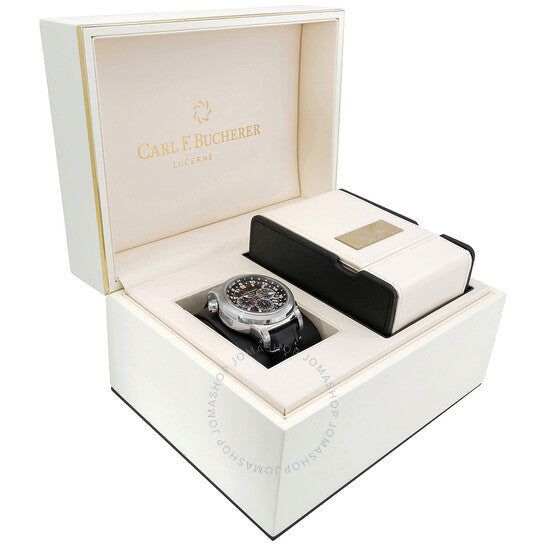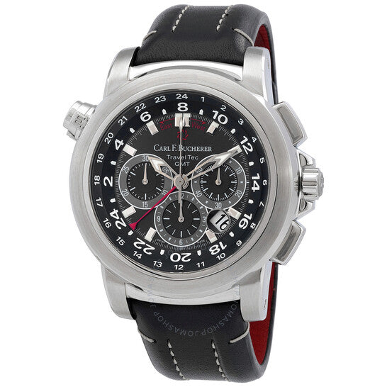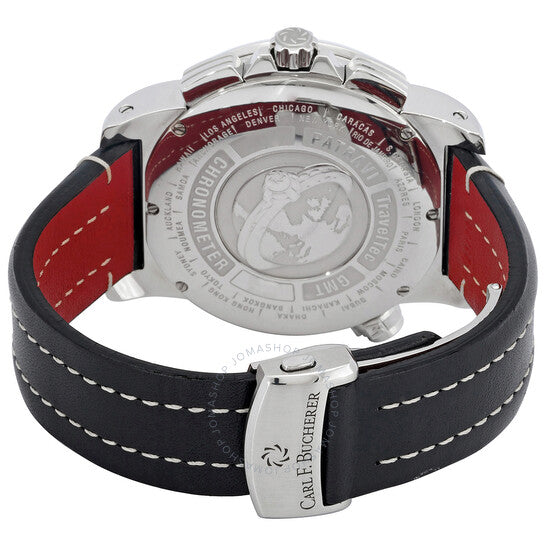 علبة من الفولاذ المقاوم للصدأ فضية اللون مع سوار جلدي أسود. إطار ثابت من الفولاذ المقاوم للصدأ فضي اللون. ميناء أسود بعقارب وعلامات ساعات فضية اللون. علامات توقيت غرينتش حول الحافة الخارجية. نوع الميناء: تناظري. عقارب وعلامات مضيئة. عرض التاريخ بين موضعي الساعة 4 و5. كرونوغراف - ثلاثة أقراص فرعية تعرض: 60 ثانية، 30 دقيقة، و12 ساعة. حركة أوتوماتيكية كارل إف. بوخرر كاليبر CFB 1901.1، مبنية على ETA 2894، تحتوي على 39 جوهرة، تنبض بمعدل 28800 ذبذبة في الساعة، ولديها احتياطي طاقة لمدة 42 ساعة تقريبًا. زجاج من الياقوت المقاوم للخدش. تاج لولبي. غطاء خلفي شفاف هيكلي. هيكل دائري الشكل، مقاسه: 46.6 مم، سُمكه: 15 مم. مقاومة للماء حتى عمق 50 مترًا / 165 قدمًا. الوظائف: كرونوغراف، تاريخ، توقيت غرينتش، منطقة زمنية ثانية، ساعات، دقائق، ثوانٍ صغيرة، كرونومتر. سلسلة باترافي ترافيلتيك. تصميم ساعة فاخر. علامة الساعة: صناعة سويسرية. تنوعات المنتج: 166.200.0. ساعة كارل إف. بوخرر باترافي ترافيلتيك كرونوغراف أوتوماتيكية للرجال 00.10620.08.33.01.