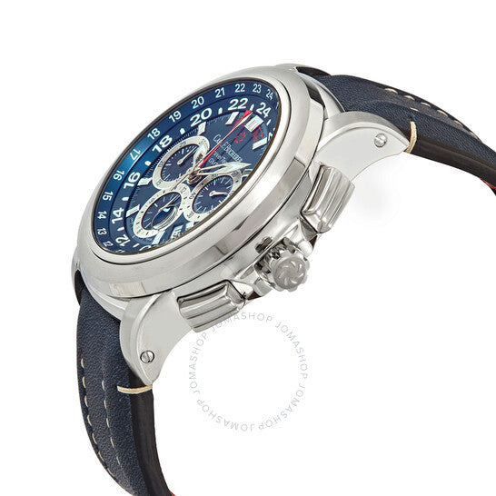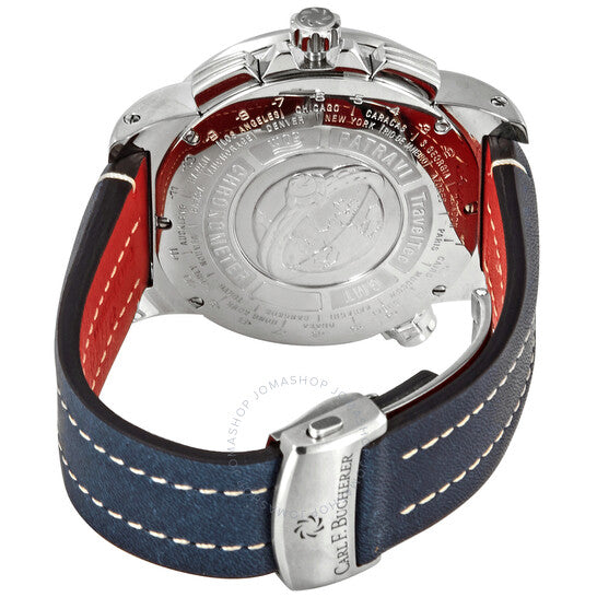 علبة من الفولاذ المقاوم للصدأ مع سوار أزرق من جلد العجل. إطار ثابت من الفولاذ المقاوم للصدأ. ميناء أزرق مع عقارب وعلامات ساعات فضية اللون. علامات دقائق. علامات ٢٤ ساعة (بتوقيت غرينتش) (دوارة) حول الحافة الخارجية. نوع الميناء: تناظري. عقارب وعلامات مضيئة. عرض التاريخ بين موضعي الساعة الرابعة والخامسة. كرونوغراف - ثلاثة أقراص فرعية تعرض: ٦٠ ثانية، ٣٠ دقيقة، و١٢ ساعة. حركة أوتوماتيكية من كارل إف. بوخرر، عيار CFB 1901.1، مبنية على ETA 2894، تحتوي على ٣٩ جوهرة، تنبض بتردد ٢٨٨٠٠ ذبذبة في الساعة، ولديها احتياطي طاقة لمدة ٤٢ ساعة تقريبًا. زجاج من الياقوت المقاوم للخدش. تاج لولبي. غطاء خلفي شفاف. شكل دائري. حجم العلبة: ٤٦.٦ مم. سمك العلبة: ١٦ مم. عرض السوار: ٢٠ مم / ٢٣ مم. مشبك قابل للطي. مقاومة للماء حتى عمق ٥٠ مترًا / ١٦٥ قدمًا. الوظائف: كرونوغراف، تاريخ، توقيت غرينتش، منطقة زمنية ثانية، ساعات، دقائق، ثوانٍ صغيرة، كرونومتر. سلسلة باترافي ترافيلتيك. تصميم ساعة فاخر. علامة الساعة: صناعة سويسرية. رقم المنتج: ١٦٦.٢٠٣.٣. ساعة كارل إف. بوخرر باترافي ترافيلتيك كرونوغراف أوتوماتيكية للرجال ٠٠.١٠٦٢٠.٠٨.٥٣.٠١.