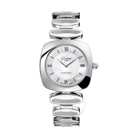 علبة وسوار من الفولاذ المقاوم للصدأ فضي اللون. إطار ثابت من الفولاذ المقاوم للصدأ فضي اللون. ميناء من عرق اللؤلؤ مع عقارب فضية اللون ومؤشرات ساعات بأرقام رومانية. نوع الميناء: تناظري. حركة كوارتز كاليبر 03-02 الأصلية من جلاشوت. زجاج ياقوت مقاوم للخدش. تاج قابل للسحب/الدفع. غطاء خلفي صلب. شكل العلبة وسادة، أبعادها: 31 مم × 31 مم، سُمكها: 7.5 مم. مشبك قابل للطي. مقاومة للماء حتى عمق 50 مترًا / 150 قدمًا. الوظائف: الساعات، الدقائق. سلسلة بافونينا. تصميم ساعة فاخرة. ملصق الساعة: صنع في ألمانيا. ساعة بافونينا كوارتز نسائية أصلية من جلاشوت، 1-03-02-05-02-14.