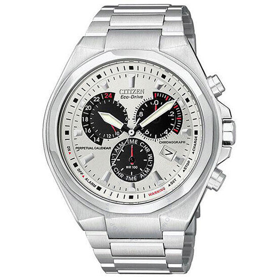 علبة وسوار من الفولاذ المقاوم للصدأ بلون فضي مصقول ومصقول. ميناء فضي مزخرف. مشبك قابل للطي بزر ضغط. إطار ثابت. زجاج معدني. آلية حركة كوارتز. قطر العلبة 46 مم، سمكها 11 مم. مقاومة الماء حتى عمق 100 متر. تقويم التاريخ عند موانئ فرعية بأربع ساعات، ساعة واحدة، وربع ثانية. وضع التوقيت المزدوج. عقرب ومؤشر ساعات مضيءان باللونين الأسود والأبيض. ساعة سيتيزن إيكو درايف للرجال BL5410-59A.
