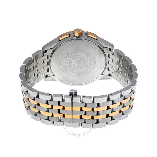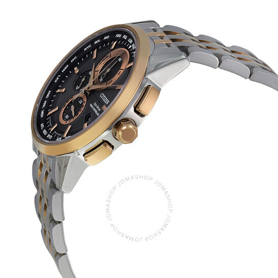 علبة من الفولاذ المقاوم للصدأ بسوار من الفولاذ المقاوم للصدأ ثنائي اللون (فضي وذهبي وردي). إطار ثابت من الذهب الوردي. ميناء أسود بعقارب وعلامات ساعات ذهبية وردية اللون. علامات دقائق. مدن التوقيت العالمي حول الحافة الخارجية. نوع الميناء: تناظري. عرض التاريخ الدائم عند موضع الساعة الرابعة. كرونوغراف - ثلاثة أقراص فرعية تعرض: ٦٠ ثانية، ٦٠ دقيقة/يوم من الأسبوع، و١/٢٠ من الثانية. آلية حركة إيكو درايف. زجاج ياقوت مقاوم للخدش. تاج قابل للسحب/الدفع. غطاء خلفي صلب. قطر العلبة: ٤٣ مم. سمكها: ١٠ مم. شكلها دائري. عرض السوار: ٢٣ مم. مشبك قابل للطي بزر ضغط. مقاومة للماء حتى عمق ١٠٠ متر / ٣٣٠ قدمًا. الوظائف: كرونوغراف، تاريخ، ساعة، دقيقة، ثانية. معلومات إضافية: تقنية ضبط الوقت الذرية مع ضبط متزامن للوقت متوفرة في ٢٦ منطقة زمنية، مع عرض المدن، وتقويم دائم، وكرونوغراف بنصف ثانية. طراز ساعة رسمية. علامة الساعة: Japan Movt. ساعة سيتيزن بيربتشوال كالندر للرجال، بمينا أسود وثنائي اللون، من الفولاذ المقاوم للصدأ، AT8116-57E.