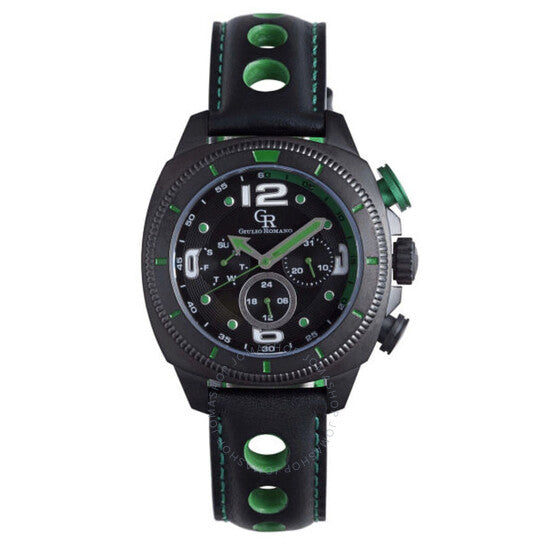 علبة سوداء من الفولاذ المقاوم للصدأ مع سوار جلدي أسود. إطار ثابت من الفولاذ المقاوم للصدأ أسود. ميناء أسود بأرقام عربية وعلامات ساعات. علامات دقائق حول الحافة الخارجية. نوع الميناء: تناظري. عرض التاريخ عند موضع الساعة 3. ثلاثة موانئ فرعية للساعة -24 ساعة، والتاريخ، وأيام الأسبوع. حركة كوارتز ISA Caliber 9238. زجاج معدني مقاوم للخدش. تاج قابل للسحب/الدفع. غطاء خلفي صلب. شكل دائري، مقاس العلبة: 42 مم، سمكها: 12.5 مم. عرض السوار: 20 مم، طوله: 8 بوصات. مشبك قابل للطي بزر ضغط. مقاومة للماء حتى عمق 50 مترًا / 165 قدمًا. الوظائف: التاريخ، اليوم، توقيت غرينتش، المنطقة الزمنية الثانية، الساعة، الدقيقة، الثانية. ساعة أنيقة. ساعة جوليو رومانو بيسكارا كوارتز للرجال بمينا سوداء GR-2000-13-006.