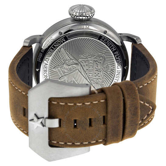 علبة من الفولاذ المقاوم للصدأ مع سوار من جلد العجل البني. إطار ثابت من الفولاذ المقاوم للصدأ. ميناء أسود مع عقارب فضية مضيئة وعلامات ساعات بأرقام عربية. علامات دقائق حول الحافة الخارجية. نوع الميناء: تناظري. عقارب وعلامات مضيئة. حركة أوتوماتيكية باحتياطي طاقة لمدة 42 ساعة. زجاج ياقوتي مقاوم للخدش. غطاء خلفي صلب. قطر العلبة: 45 مم. سمكها: 14.25 مم. شكل العلبة دائري. مشبك تانغ. مقاومة للماء حتى عمق 100 متر / 330 قدمًا. طراز ساعة رسمية. ساعة زينيث بايلوت 20 إكسترا سبيشال للرجال، مينا سوداء، جلد بني، 032430300021C738.