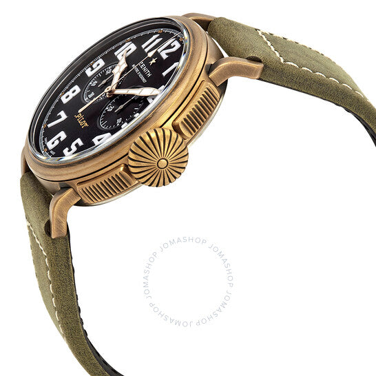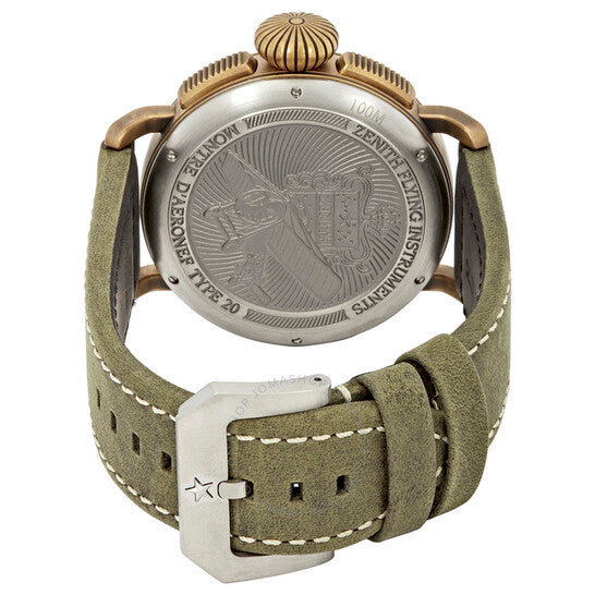 علبة برونزية بحزام من جلد العجل الأخضر. إطار برونزي ثابت. ميناء أسود بعقارب برونزية مضيئة على شكل كاتدرائية وعلامات ساعات بأرقام عربية. علامات دقائق حول الحافة الخارجية. نوع الميناء: تناظري. عقارب وعلامات مضيئة. كرونوغراف - ميناءان فرعيان يعرضان: ٦٠ ثانية، ٣٠ دقيقة. حركة أوتوماتيكية من طراز Zenith Calibre El Primero 4069، تحتوي على ٣٥ جوهرة، مكونة من ٢٥٤ جزءًا، تنبض بمعدل ٢٨٨٠٠ ذبذبة في الساعة، ولديها احتياطي طاقة يقارب ٥٠ ساعة. زجاج من الياقوت المقاوم للخدش. تاج لولبي. غطاء خلفي صلب. شكل دائري. حجم الهيكل: ٤٥ مم. سمك الهيكل: ١٤.٢٥ مم. مشبك تانغ. مقاومة للماء حتى عمق ١٠٠ متر / ٣٣٠ قدمًا. الوظائف: كرونوغراف، ساعات، دقائق، ثوانٍ. طراز ساعة الطيار. ملصق الساعة: صناعة سويسرية. ساعة زينيث بايلوت برونز كرونوغراف أوتوماتيكية للرجال 29.2430.4069/21.C800.