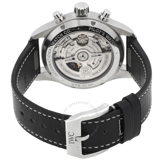 علبة من الفولاذ المقاوم للصدأ فضية اللون مع حزام جلدي أسود. إطار ثابت من الفولاذ المقاوم للصدأ فضي اللون. ميناء أزرق مع عقارب فضية اللون وعلامات ساعات رقمية عربية. علامات دقائق حول الحافة الخارجية. عقارب وعلامات مضيئة. عرض يوم الأسبوع والتاريخ عند موضع الساعة 3. كرونوغراف - ثلاثة أقراص فرعية تعرض: 60 ثانية، 30 دقيقة، و1/10 من الثانية. حركة أوتوماتيكية من طراز IWC Calibre 69385، تحتوي على 33 جوهرة، مكونة من 231 جزءًا، تنبض بسرعة 28800 ذبذبة في الساعة، ولديها احتياطي طاقة لمدة 46 ساعة تقريبًا. زجاج من الياقوت المقاوم للخدش. تاج لولبي. غطاء خلفي شفاف. شكل العلبة دائري، حجم العلبة: 41 مم، سمكها: 14.5 مم. مشبك تانغ. مقاومة للماء حتى عمق 100 متر / 330 قدمًا. الوظائف: كرونوغراف، تاريخ، يوم، ساعة، دقيقة، ثانية. سلسلة بايلوت. طراز ساعة رياضية. علامة الساعة: صناعة سويسرية. ساعة IWC Pilot Chronograph أوتوماتيكية بمينا زرقاء للرجال IW388101BK.