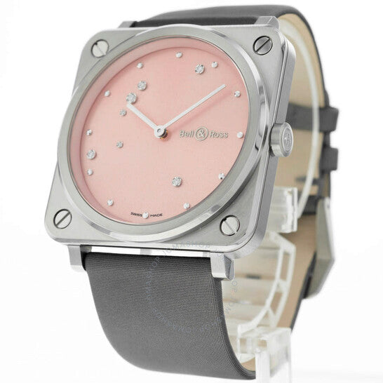 علبة من الفولاذ المقاوم للصدأ فضية اللون مع سوار أسود من الساتان. إطار ثابت من الفولاذ المقاوم للصدأ فضي اللون. ميناء وردي (كوكبة النسر) بعقارب فضية اللون وعلامات ساعات منقطة. نوع الميناء: تناظري. حركة كوارتز بيل آند روس عيار BR-CAL.102. زجاج ياقوت مقاوم للخدش. تاج قابل للسحب/الدفع. غطاء خلفي صلب. شكل العلبة مربع، مقاسها: 39 مم. طول السوار: 7 بوصات. مشبك تانغ. مقاومة للماء حتى عمق 100 متر / 330 قدمًا. الوظائف: الساعات والدقائق. معلومات إضافية: كوكبة النسر على الميناء مرصعة بسبع ماسات. سلسلة النسر الماسية الوردية. طراز ساعة فاخرة. علامة الساعة: صناعة سويسرية. ساعة بيل آند روس كوارتز نسائية من الألماس الوردي والنسر BRS-EP-ST/SCR-SAT.