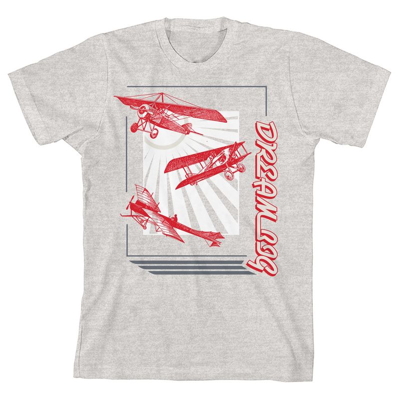 - يتميز تي شيرت الطائرة المصمم خصيصًا بصورة كبيرة وجريئة لثلاث طائرات كلاسيكية وكلمات "Dream Big" التي تمت طباعتها بشكل احترافي على خلفية رمادية اللون الشوفاني لضمان جودة طباعة تدوم طويلاً.