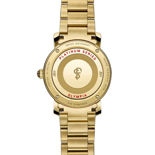 استمتع بالإثارة. ساعة أولمبيا PS تتألق باثنتي عشرة ياقوتة تُشير إلى الساعات على وجهها، وواحدة على التاج، و510 ماسات مُرصّعة على السوار والميناء والإطار المُحاط، بوزن إجمالي يبلغ 2.55 قيراط. مصنوعة من فولاذ مقاوم للصدأ متين مطلي بالذهب عيار 18 قيراطًا، بآلية حركة سويسرية، ومحمية بضمان بلاتيني لمدة أربع سنوات. تأتي مع علبة تخزين PS حصرية، محفور عليها رقم الإنتاج الخاص بها.