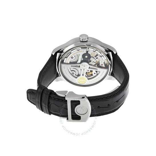 علبة فضية اللون من الفولاذ المقاوم للصدأ مع حزام أسود من جلد التمساح. إطار ثابت من الفولاذ المقاوم للصدأ فضي اللون. ميناء فضي مع عقارب على شكل ورقة شجر من الذهب الوردي وعلامات ساعات رقمية عربية. علامات دقائق حول الحافة الخارجية. نوع الميناء: تناظري. عرض التاريخ عند موضع الساعة السادسة. ميناءان فرعيان يعرضان: احتياطي طاقة لمدة 7 أيام و60 ثانية. حركة أوتوماتيكية من طراز IWC Calibre 52010، تحتوي على 31 جوهرة، مكونة من 257 جزءًا، تنبض بمعدل 28800 ذبذبة في الساعة، ولديها احتياطي طاقة لمدة 168 ساعة تقريبًا. زجاج من الياقوت المقاوم للخدش. تاج لولبي. ظهر هيكلي. شكل دائري، حجم العلبة: 42.3 مم، سمك العلبة: 14.5 مم. عرض السوار: 20 مم. مشبك قابل للطي. مقاومة للماء حتى عمق 30 مترًا / 100 قدم. الوظائف: الساعة، الدقائق، الثواني الصغيرة، مؤشر احتياطي الطاقة. سلسلة بورتوجيزر. تصميم ساعة فاخرة. علامة الساعة: صناعة سويسرية. ساعة IWC Portugieser أوتوماتيكية للرجال بمينا فضي IW500704.