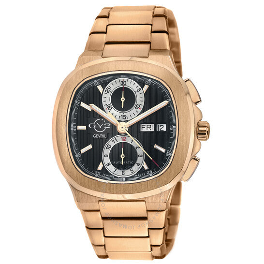 علبة وسوار من الفولاذ المقاوم للصدأ بلون الذهب الوردي. إطار ثابت من الفولاذ المقاوم للصدأ بلون الذهب الوردي. ميناء أسود مع عقارب وعلامات ساعات ذهبية وردية. علامات دقائق حول الحافة الخارجية. نوع الميناء: تناظري. عقارب وعلامات مضيئة. عرض يوم الأسبوع والتاريخ عند موضع الساعة 3. كرونوغراف - ميناءان فرعيان يعرضان: 30 دقيقة و12 ساعة. حركة أوتوماتيكية ETA-Valjoux Caliber 7750، تحتوي على 25 جوهرة، تنبض بمعدل 28800 ذبذبة في الساعة، ولديها احتياطي طاقة لمدة 44 ساعة تقريبًا. كريستال ياقوت مقاوم للخدش. تاج سحب/دفع. غطاء خلفي شفاف. شكل العلبة وسادة، حجم العلبة: 40 مم، سمك العلبة: 16 مم. عرض السوار: 20 مم. مشبك قابل للطي بزر ضغط. مقاومة للماء حتى عمق 50 مترًا / 165 قدمًا. الوظائف: كرونوغراف، تاريخ، يوم، ساعة، دقيقة، ثانية. معلومات إضافية: كرونوغراف. سلسلة بوتينتي كرونوغراف. تصميم ساعة فاخر. علامة الساعة: صناعة سويسرية. ساعة GV2 من جيفريل بوتينتي كرونوغراف للرجال، بمينا أسود، موديل 18502B.