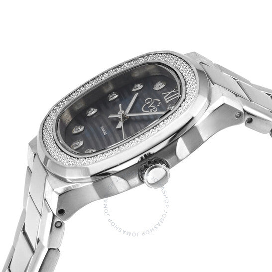 علبة وسوار من الفولاذ المقاوم للصدأ فضي اللون. إطار ثابت من الفولاذ المقاوم للصدأ فضي اللون. ميناء من عرق اللؤلؤ مع عقارب فضية اللون وعلامات ساعات من الألماس. نوع الميناء: تناظري. عقارب مضيئة. آلية حركة كوارتز. زجاج ياقوت مقاوم للخدش. تاج قابل للسحب/الدفع. غطاء خلفي صلب. شكل العلبة وسادة، مقاس العلبة: 33 مم، سمكها: 8.5 مم. عرض السوار: 16 مم. مشبك قابل للطي بزر ضغط. مقاومة للماء حتى عمق 50 مترًا / 165 قدمًا. الوظائف: الساعات، الدقائق، الثواني. معلومات إضافية: 11 ماسة. سلسلة بوتينتي. ساعة أنيقة. ساعة GV2 من جيفريل بوتينتي كوارتز نسائية مرصعة بالألماس، 18200B.