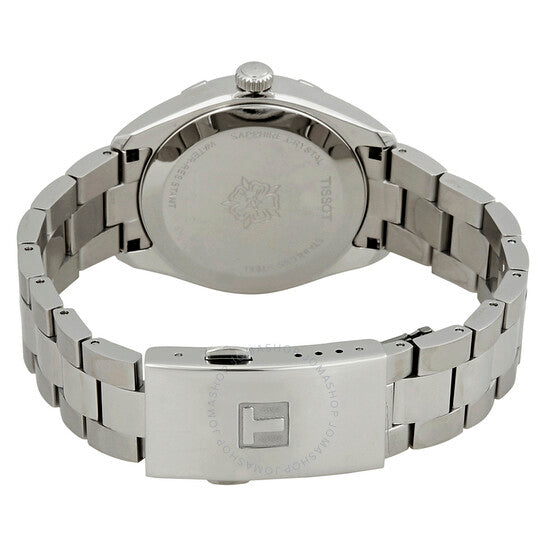 علبة من الفولاذ المقاوم للصدأ مع سوار من الفولاذ المقاوم للصدأ. إطار ثابت من الفولاذ المقاوم للصدأ. ميناء فضي مع عقارب ومؤشرات ساعات فضية مضيئة. مؤشرات دقائق حول الحافة الخارجية. نوع الميناء: تناظري. عقارب ومؤشرات مضيئة. عرض التاريخ عند موضع الساعة 3. حركة كوارتز عيار ETA 955.412. زجاج ياقوتي مقاوم للخدش. تاج قابل للسحب/الدفع. غطاء خلفي صلب. شكل دائري. حجم العلبة: 36 مم. سمكها: 9 مم. عرض السوار: 18 مم. مشبك قابل للطي بزر ضغط. مقاومة للماء حتى عمق 100 متر / 330 قدمًا. الوظائف: التاريخ، الساعة، الدقائق، الثواني، مؤشر عمر البطارية. تصميم ساعة كاجوال. علامة الساعة: صناعة سويسرية. ساعة تيسوت PR100 نسائية من الفولاذ المقاوم للصدأ بمينا فضي T101.910.11.031.00.