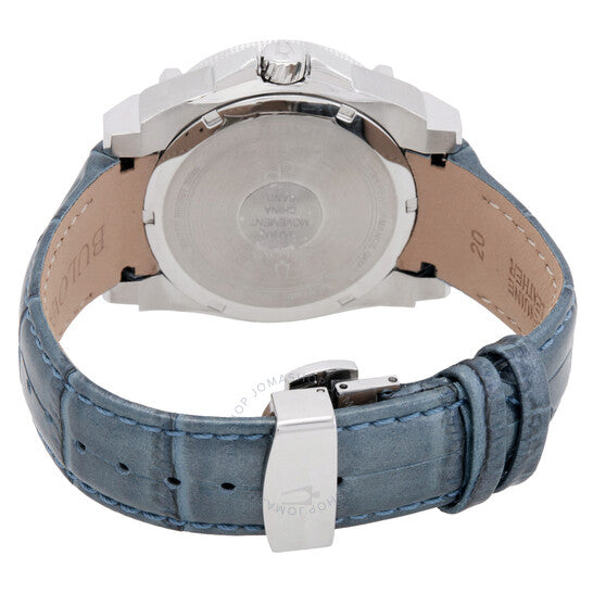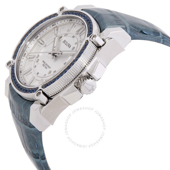 علبة من الفولاذ المقاوم للصدأ فضية اللون مع سوار جلدي أزرق. إطار ثابت فضي اللون مرصع بالكريستال. ميناء فضي اللون مع عقارب فضية اللون وعلامات ساعات. علامات دقائق بأرقام عربية (بفاصل 5 دقائق). نوع الميناء: تناظري. عرض التاريخ عند موضع الساعة 3. آلية حركة كوارتز. زجاج ياقوتي مقاوم للخدش. غطاء خلفي صلب. شكل العلبة دائري، مقاسها 40 مم. إبزيم قابل للطي بزر ضغط. مقاومة للماء حتى عمق 100 متر / 330 قدمًا. الوظائف: التاريخ، الساعة، الدقائق، الثواني. سلسلة بريسيجنست. ساعة بولوفا بريسيجنست كوارتز كريستال نسائية بمينا فضي، 96J126.