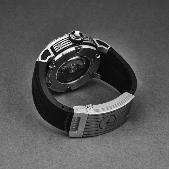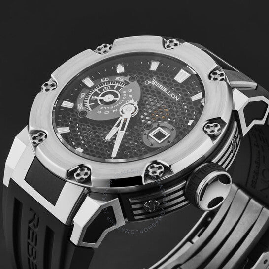 علبة تيتانيوم رمادية اللون مع سوار مطاطي أسود. إطار ثابت من التيتانيوم الرمادي. ميناء أسود بعقارب وعلامات ساعات فضية اللون. علامات دقائق حول الحافة الخارجية. نوع الميناء: تناظري. عقارب وعلامات مضيئة. عرض التاريخ عند موضع الساعة 3. آلية حركة أوتوماتيكية. زجاج ياقوت مقاوم للخدش. تاج لولبي. غطاء خلفي شفاف. شكل دائري، مقاس العلبة: 48 مم، سمكها: 16.3 مم. عرض السوار: 30 مم. مشبك قابل للطي بزر ضغط. مقاومة للماء حتى عمق 100 متر / 330 قدمًا. الوظائف: التاريخ، الساعة، الدقائق، الثواني. سلسلة بريداتور. تصميم ساعة فاخرة. ساعة ريبيليون بريداتور أوتوماتيكية للرجال بمينا أسود RB.PR.3H.TI.