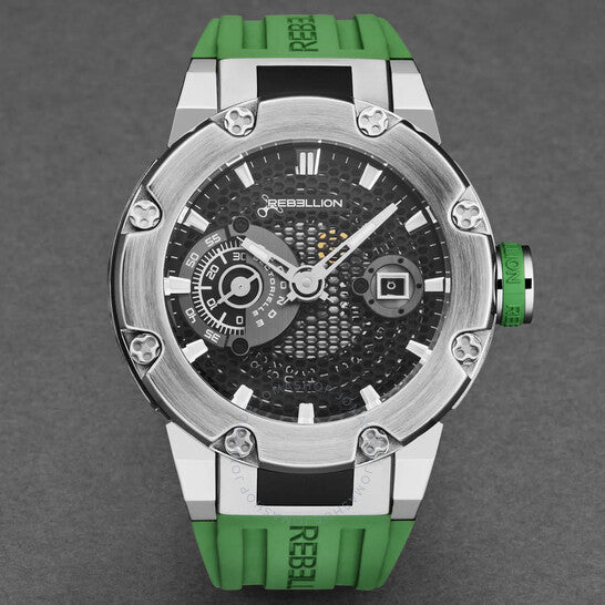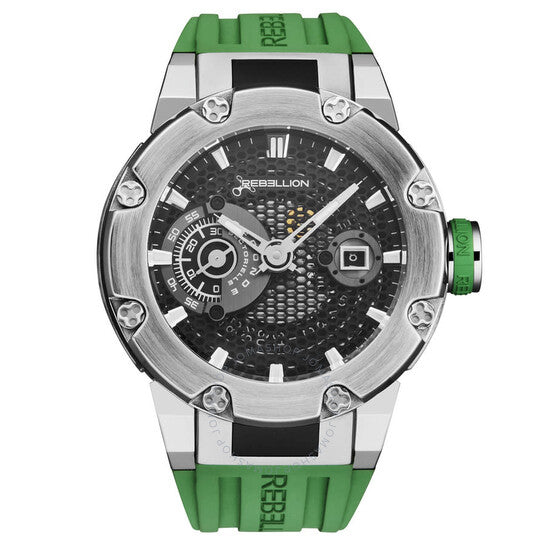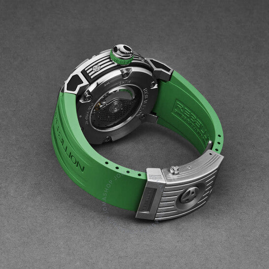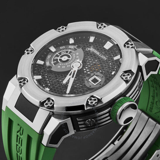 علبة تيتانيوم رمادية اللون مع سوار مطاطي أخضر. إطار ثابت من التيتانيوم الرمادي. ميناء أسود بعقارب وعلامات ساعات فضية اللون. علامات دقائق حول الحافة الخارجية. نوع الميناء: تناظري. عقارب وعلامات مضيئة. عرض التاريخ عند موضع الساعة 3. آلية حركة أوتوماتيكية. زجاج ياقوت مقاوم للخدش. تاج لولبي. غطاء خلفي شفاف. شكل دائري، مقاس العلبة: 48 مم، سمكها: 16.3 مم. عرض السوار: 30 مم. مشبك قابل للطي بزر ضغط. مقاومة للماء حتى عمق 100 متر / 330 قدمًا. الوظائف: التاريخ، الساعة، الدقائق، الثواني. سلسلة بريداتور. تصميم ساعة فاخرة. ساعة ريبيليون بريداتور أوتوماتيكية للرجال بمينا أسود RB.PR.3H.TI-2.