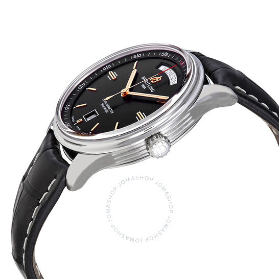 علبة من الفولاذ المقاوم للصدأ مع سوار أسود من جلد التمساح. إطار ثابت من الفولاذ المقاوم للصدأ. ميناء أسود بعقارب مضيئة بلون الذهب الوردي وعلامات ساعات. علامات دقائق بأرقام عربية (بفاصل 5 دقائق). علامات دقائق حول الحافة الخارجية. نوع الميناء: تناظري. عقارب وعلامات مضيئة. عرض التاريخ عند موضع الساعة 6. عرض أيام الأسبوع في مركز موضع الساعة 12. حركة بريتلينغ أوتوماتيكية من عيار 45، مبنية على ETA 2834-2، تحتوي على 25 جوهرة، تنبض بمعدل 28800 ذبذبة في الساعة، ولديها احتياطي طاقة لمدة 42 ساعة تقريبًا. زجاج ياقوت مقاوم للخدش. تاج قابل للسحب/الدفع. غطاء خلفي صلب. شكل العلبة دائري، مقاسها: 40 مم. سمكها: 11.40 مم. عرض السوار: 20 مم. مشبك قابل للطي بزر ضغط للتحرير. مقاومة للماء حتى عمق 100 متر / 330 قدمًا. الوظائف: التاريخ، اليوم، الساعة، الدقيقة، الثانية، الكرونومتر. سلسلة بريميير. تصميم ساعة فاخر. علامة الساعة: صناعة سويسرية. ساعة بريتلينغ بريميير أوتوماتيكية كرونومتر بمينا أسود للرجال A45340241B1P1.