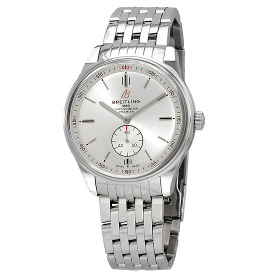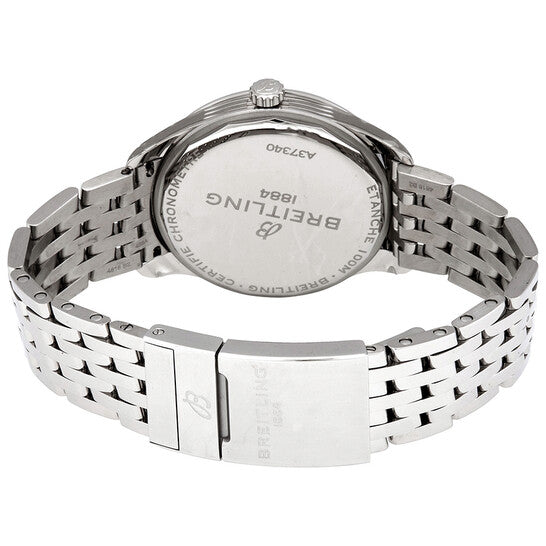 علبة من الفولاذ المقاوم للصدأ مع سوار من الفولاذ المقاوم للصدأ. إطار ثابت من الفولاذ المقاوم للصدأ. ميناء فضي مع عقارب ومؤشرات ساعات فضية مضيئة. مؤشرات دقائق بأرقام عربية (بفاصل 5 دقائق). مؤشرات دقائق حول الحافة الخارجية. نوع الميناء: تناظري. عقارب ومؤشرات مضيئة. ميناء فرعي للثواني الصغيرة. حركة بريتلينغ أوتوماتيكية كاليبر 37 مع احتياطي طاقة لمدة 42 ساعة. زجاج من الياقوت المقاوم للخدش. تاج قابل للسحب/الدفع. غطاء خلفي صلب. شكل دائري. حجم العلبة: 40 مم. سمك العلبة: 11.40 مم. عرض السوار: 20 مم. مشبك قابل للطي بزر ضغط. مقاومة للماء حتى عمق 100 متر / 330 قدمًا. الوظائف: ساعة، دقيقة، ثانية صغيرة، كرونومتر. تصميم ساعة فاخرة. ملصق الساعة: صناعة سويسرية. ساعة بريتلينغ بريمير أوتوماتيكية كرونومتر للرجال بمينا فضي A37340351G1A1.