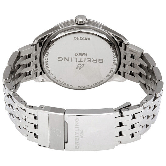 علبة من الفولاذ المقاوم للصدأ مع سوار من الفولاذ المقاوم للصدأ. إطار ثابت من الفولاذ المقاوم للصدأ. ميناء فضي مع عقارب مضيئة بلون الذهب الوردي وعلامات ساعات. علامات دقائق حول الحافة الخارجية. نوع الميناء: تناظري. عقارب وعلامات مضيئة. عرض التاريخ عند موضع الساعة 6، وعرض أيام الأسبوع في مركز موضع الساعة 12. حركة بريتلينغ أوتوماتيكية كاليبر 45 مع احتياطي طاقة لمدة 38 ساعة. زجاج ياقوت مقاوم للخدش. تاج قابل للسحب/الدفع. غطاء خلفي صلب. شكل دائري. حجم العلبة: 40 مم. سمك العلبة: 11.40 مم. عرض السوار: 20 مم. مشبك قابل للطي بزر ضغط. مقاومة للماء حتى عمق 100 متر / 330 قدمًا. الوظائف: التاريخ، اليوم، الساعة، الدقيقة، الثانية. تصميم ساعة فاخرة. علامة الساعة: صناعة سويسرية. ساعة بريتلينغ بريميير أوتوماتيكية للرجال بمينا فضي A45340211G1A1.