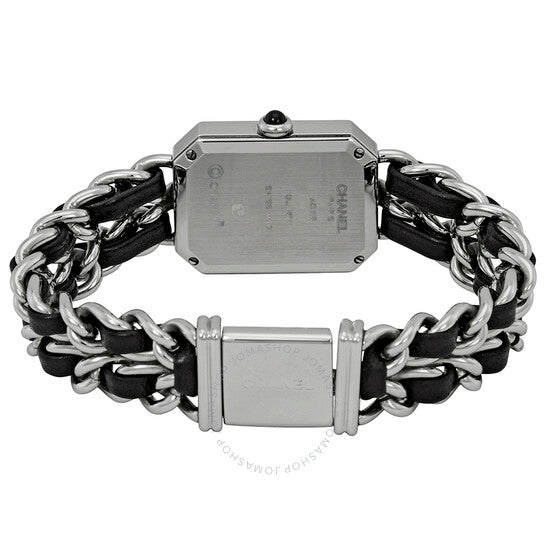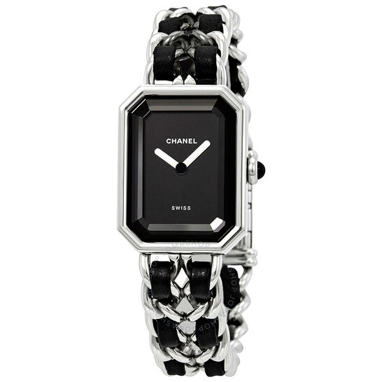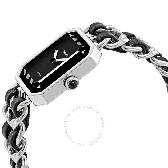 علبة من الفولاذ المقاوم للصدأ مع سوار من الفولاذ المقاوم للصدأ بسلسلة متشابكة من الجلد الأسود. إطار ثابت من الفولاذ المقاوم للصدأ. ميناء أسود مطلي بالورنيش مع عقارب فضية اللون. لا توجد علامات. اسم شانيل يظهر فوق الميناء المركزي. نوع الميناء: تناظري. حركة كوارتز. زجاج ياقوت مقاوم للخدش. تاج قابل للسحب/الدفع. غطاء خلفي صلب. شكل مضلع. أبعاد العلبة: ١٩.٥ مم × ١٥ مم. سُمك العلبة: ١٢ مم. مشبك مجوهرات. مقاومة للماء حتى عمق ٣٠ مترًا / ١٠٠ قدم. الوظائف: الساعات، الدقائق. طراز ساعة رسمية. علامة الساعة: صناعة سويسرية. ساعة شانيل بريميير النسائية بمينا أسود H0451.