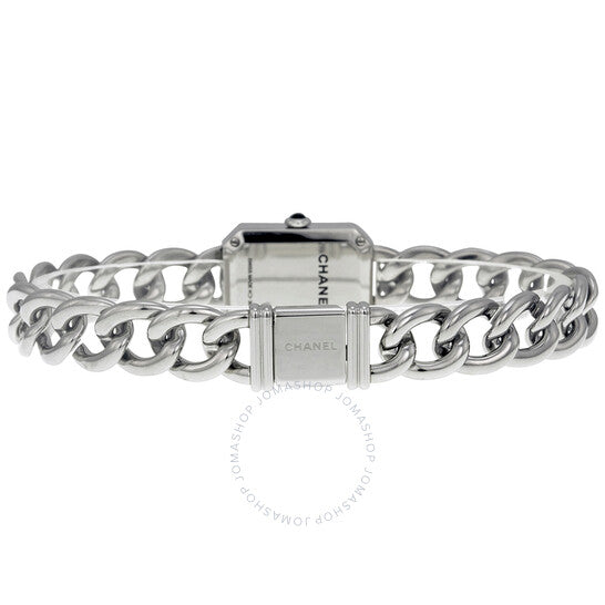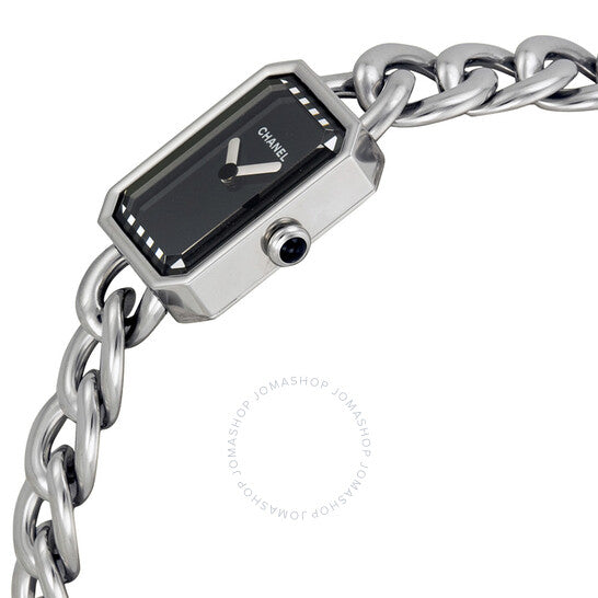 علبة من الفولاذ المقاوم للصدأ مع سوار لولبي من الفولاذ المقاوم للصدأ. إطار ثابت من الفولاذ المقاوم للصدأ. ميناء أسود بعقارب فضية اللون. بدون علامات. يظهر اسم شانيل أسفل موضع الساعة ١٢. نوع الميناء: تناظري. حركة كوارتز. زجاج ياقوت مقاوم للخدش. تاج دفع/سحب مرصع بحجر أونيكس كابوشون. غطاء خلفي صلب. أبعاد العلبة: ١٦ مم × ٢٢ مم. شكل العلبة مستطيل. مشبك مجوهرات. مقاومة للماء حتى عمق ٣٠ مترًا / ١٠٠ قدم. الوظائف: الساعات، الدقائق. طراز ساعة رسمية. ساعة شانيل بريمير النسائية بمينا أسود من الفولاذ المقاوم للصدأ H3248.