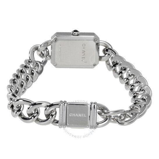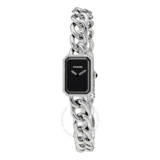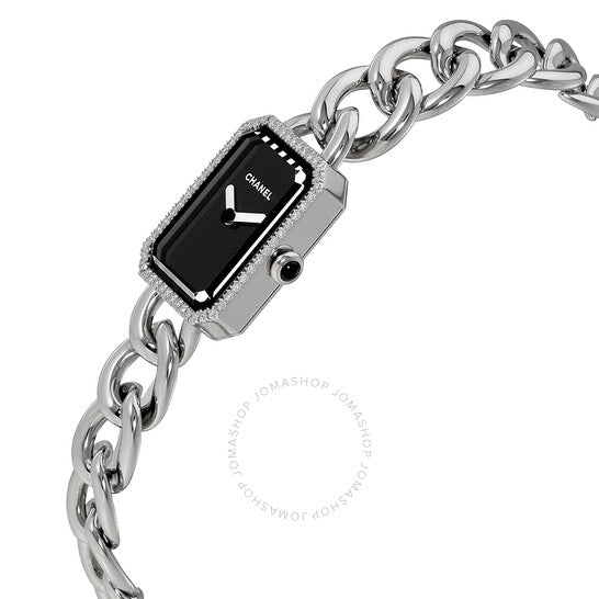 علبة من الفولاذ المقاوم للصدأ مع سوار من الفولاذ المقاوم للصدأ. إطار ثابت من الفولاذ المقاوم للصدأ مرصع بـ 56 ماسة. ميناء أسود مطلي بالورنيش مع عقارب فضية اللون. بدون مؤشرات. نوع الميناء: تناظري. حركة كوارتز. زجاج ياقوت مقاوم للخدش. تاج قابل للسحب/الدفع. غطاء خلفي صلب. أبعاد العلبة: 16 مم × 22 مم. سُمك العلبة: 6.2 مم. شكل العلبة مستطيل. مشبك مجوهرات. مقاومة للماء حتى عمق 30 مترًا / 100 قدم. الوظائف: الساعات، الدقائق. معلومات إضافية: تاج مرصع بحجر أونيكس كابوشون. تصميم ساعة فاخرة. علامة الساعة: صناعة سويسرية. ساعة شانيل بريمير النسائية بمينا أسود وستانلس ستيل H3252.