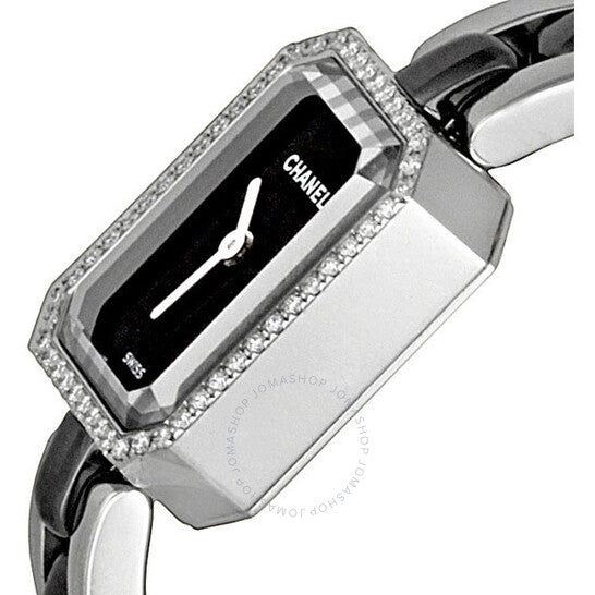 علبة من الفولاذ المقاوم للصدأ مع سوار فولاذي مصقول بوصلات مركزية من السيراميك الأسود. إطار ثابت من الفولاذ المقاوم للصدأ مرصع بالألماس. ميناء أسود بعقارب فضية اللون. بدون علامات. يظهر اسم شانيل أسفل موضع الساعة ١٢. حركة كوارتز. كريستال ياقوتي مقاوم للخدش. غطاء خلفي صلب. أبعاد العلبة: ١٩.٥ مم × ١٥ مم. مشبك مجوهرات. مقاومة للماء حتى عمق ٣٠ مترًا/١٠٠ قدم. الوظائف: الساعات، الدقائق. ساعة شانيل بريمير النسائية بعلبة ألماس H2163.