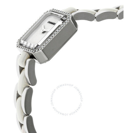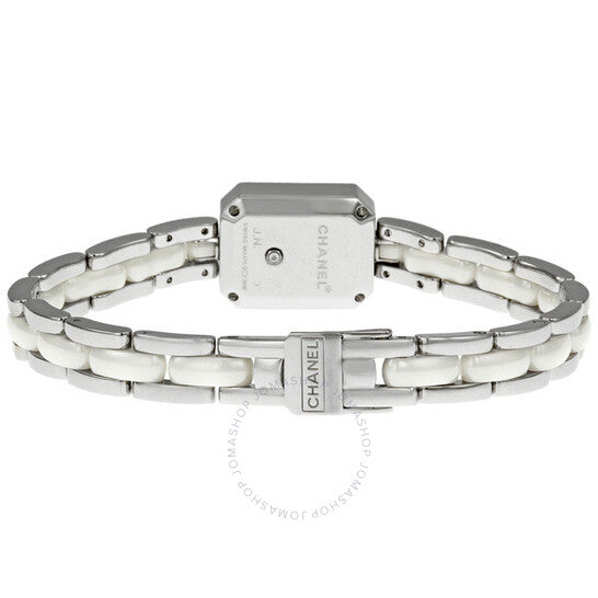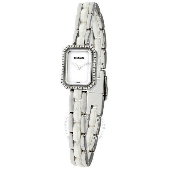 علبة من السيراميك والفولاذ المصقول، مع سوار من الفولاذ المقاوم للصدأ بوصلات مركزية من السيراميك الأبيض. إطار ثابت من الفولاذ المقاوم للصدأ مرصع بالألماس. ميناء أبيض بعقارب فضية اللون. بدون علامات. يظهر اسم شانيل أسفل موضع الساعة ١٢. حركة كوارتز تعمل بالبطارية. زجاج من الياقوت المقاوم للخدش. غطاء خلفي صلب. قطر العلبة: ١٥ مم. مشبك مجوهرات. مقاومة للماء حتى عمق ٣٠ مترًا / ١٠٠ قدم. الوظائف: الساعات، الدقائق. ساعة شانيل بريميير دايموند كوارتز نسائية H2132.