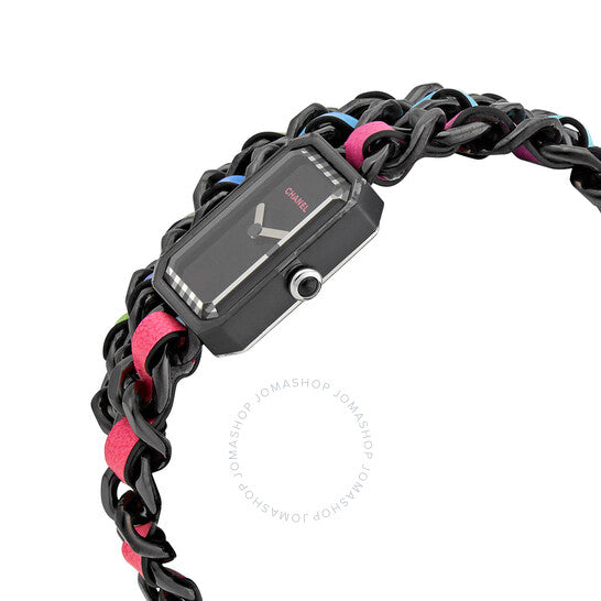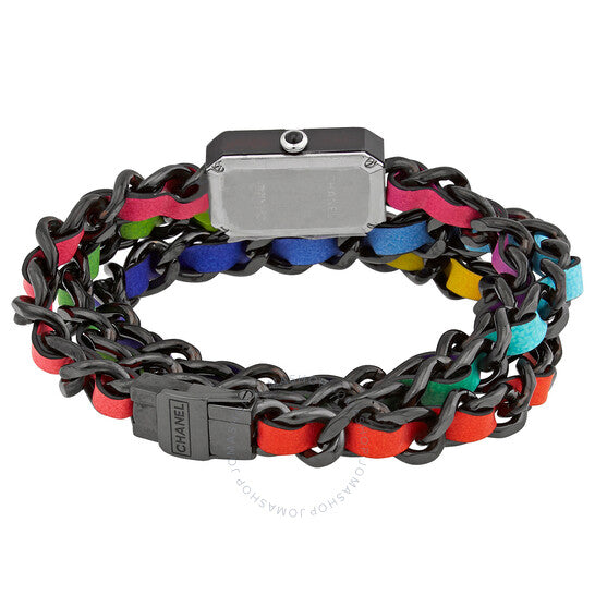 علبة من الفولاذ المقاوم للصدأ مطلية باللون الأسود بتقنية PVD، مع سلسلة فولاذية ثلاثية الصفوف مطلية باللون الأسود بتقنية PVD، وسوار جلدي متشابك بلون قوس قزح نيون. إطار ثابت مطلي باللون الأسود بتقنية PVD. ميناء أسود بعقارب فضية اللون. بدون مؤشرات. نوع الميناء: تناظري. حركة كوارتز. زجاج ياقوتي مقاوم للخدش. تاج قابل للسحب/الدفع. غطاء خلفي صلب. شكل مستطيل. أبعاد العلبة: ٢٣.٦ مم × ١٥.٨ مم. سُمكها: ٦.٢ مم. مشبك مجوهرات. مقاومة للماء حتى عمق ٣٠ مترًا / ١٠٠ قدم. الوظائف: الساعات، الدقائق. سلسلة Premiere Electro. ساعة كاجوال أنيقة. ساعة Chanel Premiere Electro كوارتز نسائية بمينا سوداء H6950.