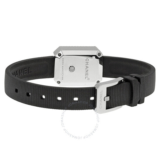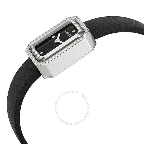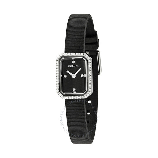 علبة من الفولاذ المقاوم للصدأ مع سوار مطاطي أسود. إطار ثابت من الفولاذ المقاوم للصدأ مرصع بالألماس. ميناء أسود مطلي بالورنيش مع عقارب فولاذية. أحجار ألماس تُشير إلى مواقع الساعات 3 و6 و9 و12. نوع الميناء: تناظري. عقارب وعلامات الميناء مضيئة. آلية حركة كوارتز. زجاج ياقوت مقاوم للخدش. تاج قابل للسحب/الدفع. غطاء خلفي صلب. مقاس العلبة: 19.5 مم × 15 مم. سُمك العلبة: 12 مم. شكل العلبة مستطيل. مشبك تانغ. مقاومة للماء حتى عمق 30 مترًا / 100 قدم. الوظائف: الساعات، الدقائق. طراز ساعة فاخرة. ماركة الساعة: سويسرية. ساعة شانيل بريمير النسائية H2434.