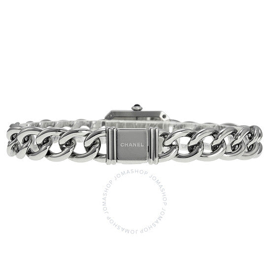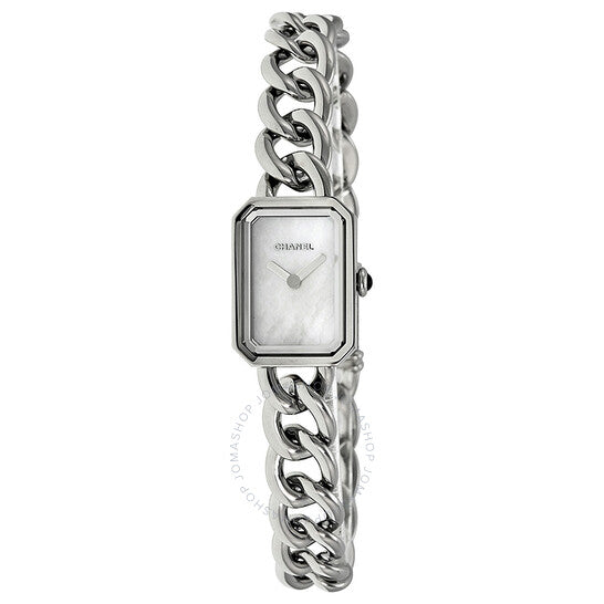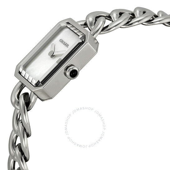 علبة من الفولاذ المقاوم للصدأ مع سوار من الفولاذ المقاوم للصدأ بحلقات ملتوية. إطار ثابت من الفولاذ المقاوم للصدأ. ميناء من عرق اللؤلؤ مع عقارب فضية اللون. بدون علامات. يظهر اسم شانيل أسفل موضع الساعة ١٢. نوع الميناء: تناظري. حركة كوارتز. زجاج ياقوت مقاوم للخدش. تاج دفع/سحب مرصع بحجر أونيكس كابوشون. غطاء خلفي صلب. شكل العلبة مستطيل. أبعاد العلبة: ٢٢ مم × ١٦ مم. سمكها: ٦.٢ مم. مشبك مجوهرات. مقاومة للماء حتى عمق ٣٠ مترًا / ١٠٠ قدم. الوظائف: الساعات، الدقائق. طراز ساعة رسمية. ساعة شانيل بريمير النسائية بمينا من عرق اللؤلؤ H3249.