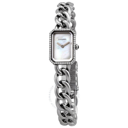 علبة من الفولاذ المقاوم للصدأ مع سوار من الفولاذ المقاوم للصدأ بحلقات سلسلة. إطار ثابت من الفولاذ المقاوم للصدأ مرصع بـ 56 ماسة. ميناء أبيض من عرق اللؤلؤ مع عقارب فضية اللون. بدون مؤشرات. نوع الميناء: تناظري. حركة كوارتز. زجاج ياقوت مقاوم للخدش. تاج سحب/دفع مرصع بحجر أونيكس كابوشون. غطاء خلفي صلب. شكل العلبة مستطيل. أبعاد العلبة: 22 مم × 16 مم. سمك العلبة: 6.2 مم. مشبك مجوهرات. مقاومة للماء حتى عمق 30 مترًا / 100 قدم. الوظائف: الساعات والدقائق. معلومات إضافية: علبة مرصعة بـ 56 ماسة بقطع بريانت (~0.19 قيراط)، تاج مرصع بحجر أونيكس كابوشون. سلسلة بريميير. طراز ساعة فاخرة. علامة الساعة: صناعة سويسرية. ساعة شانيل بريميير النسائية بمينا من عرق اللؤلؤ H3253.