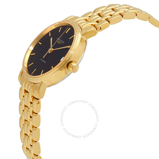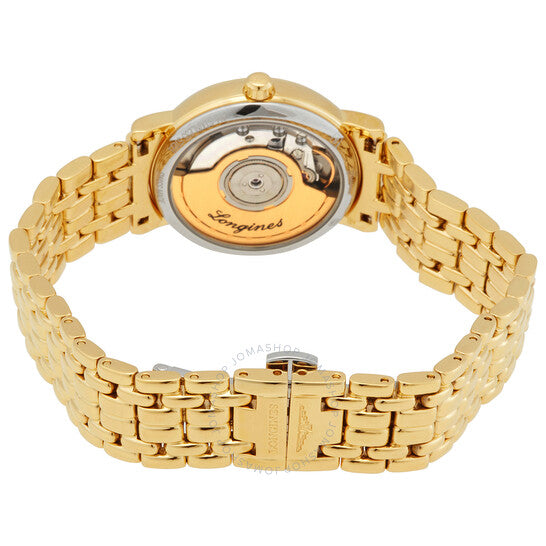 علبة وسوار من الفولاذ المقاوم للصدأ مطليان بالذهب الأصفر بتقنية PVD. إطار ثابت مطلي بالذهب الأصفر بتقنية PVD. ميناء أسود بعقارب وعلامات ساعات ذهبية اللون. علامات دقائق حول الحافة الخارجية. نوع الميناء: تناظري. عرض التاريخ عند موضع الساعة الثالثة. حركة أوتوماتيكية من لونجين، عيار L619، مبنية على ETA 2892-A2، تحتوي على 21 جوهرة، تنبض بتردد 28800 ذبذبة في الساعة، ولديها احتياطي طاقة يدوم حوالي 42 ساعة. زجاج من الياقوت المقاوم للخدش. تاج قابل للسحب/الدفع. غطاء خلفي شفاف. شكل دائري. حجم العلبة: 30 مم. سمكها: 7.6 مم. عرض السوار: 16 مم. مشبك قابل للطي مع مفتاح أمان. مقاومة للماء حتى عمق 30 مترًا / 100 قدم. الوظائف: التاريخ، الساعة، الدقائق، الثواني. سلسلة Presence. طراز ساعة رسمية. علامة الساعة: صناعة سويسرية. ساعة لونجين بريسنس أوتوماتيكية بمينا أسود للسيدات L4.322.2.52.8.