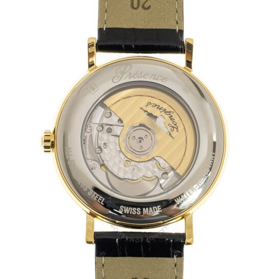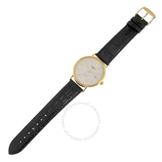 علبة من الفولاذ المقاوم للصدأ بلون الذهب الأصفر مع سوار جلدي أسود. إطار ثابت من الفولاذ المقاوم للصدأ بلون الذهب الأصفر. ميناء أبيض بعقارب وعلامات ساعات ذهبية صفراء. علامات دقائق حول الحافة الخارجية. نوع الميناء: تناظري. عرض التاريخ عند موضع الساعة 3. حركة أوتوماتيكية. زجاج ياقوتي مقاوم للخدش. غطاء خلفي شفاف. شكل العلبة دائري، مقاسها: 40 مم. مشبك بإبزيم. الوظائف: التاريخ، الساعة، الدقائق، الثانية. معلومات إضافية: العلبة الأصلية، بطاقة ضمان دولية، دليل الاستخدام (ملحقات كاملة). سلسلة بريسنس. طراز ساعة فاخرة. ملصق الساعة: صناعة سويسرية. ساعة لونجين بريسنس أوتوماتيكية للرجال بمينا أبيض، L4.922.2.12.2.