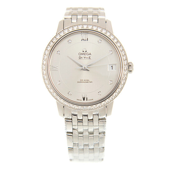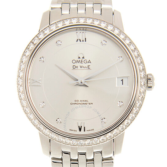 علبة من الفولاذ المقاوم للصدأ مع سوار فضي اللون. إطار ثابت مرصع بالألماس. ميناء فضي اللون مع عقارب فضية اللون وأرقام رومانية وعلامات ساعات من الألماس. نوع الميناء: تناظري. عرض التاريخ عند موضع الساعة 3. حركة أوميغا كاليبر 2500 أوتوماتيكية مع احتياطي طاقة لمدة 48 ساعة. زجاج ياقوتي مقاوم للخدش. حجم العلبة: 32.7 مم. سُمكها: 9.5 مم. شكلها دائري. عرض السوار: 16 مم. مقاومة للماء حتى عمق 100 متر / 330 قدمًا. الوظائف: التاريخ، الساعات، الدقائق، الثواني، ميزان محوري، كرونومتر. طراز ساعة فاخرة. علامة الساعة: صناعة سويسرية. ساعة أوميغا بريستيج أوتوماتيكية نسائية 424.15.33.20.52.001.
