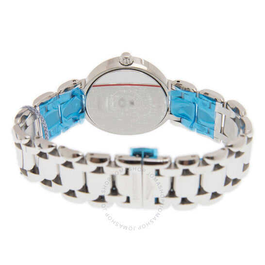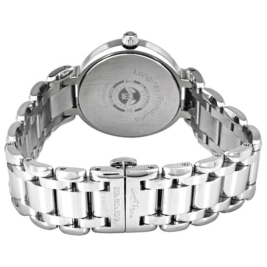 علبة وسوار من الفولاذ المقاوم للصدأ فضي اللون. إطار ثابت من الفولاذ المقاوم للصدأ فضي اللون. ميناء فضي مع عقارب على شكل سيف من الفولاذ المزرق وعلامات ساعات بأرقام رومانية. علامات دقائق حول الحافة الخارجية. نوع الميناء: تناظري. عرض التاريخ عند موضع الساعة 3. موانئ فرعية لعرض أطوار القمر. حركة كوارتز من لونجين كاليبر L296. كريستال ياقوتي مقاوم للخدش. غطاء خلفي صلب. شكل دائري، مقاس العلبة: 30 مم، سمكها: 9.3 مم. عرض السوار: 7 مم. مشبك فراشة. مقاومة للماء حتى عمق 30 مترًا / 100 قدم. الوظائف: أطوار القمر، التاريخ، الساعات، الدقائق، الثواني. سلسلة بريما لونا. تصميم ساعة فاخرة. علامة الساعة: صناعة سويسرية. ساعة لونجين بريما لونا كوارتز نسائية بمينا فضي، L8.115.4.71.6.