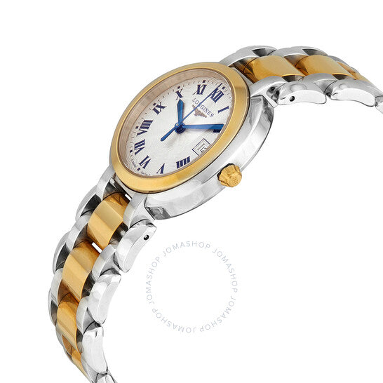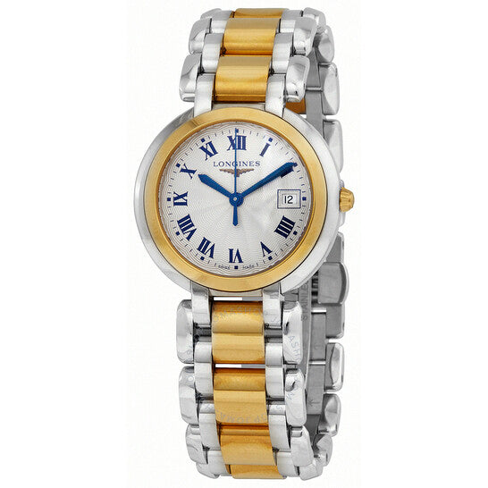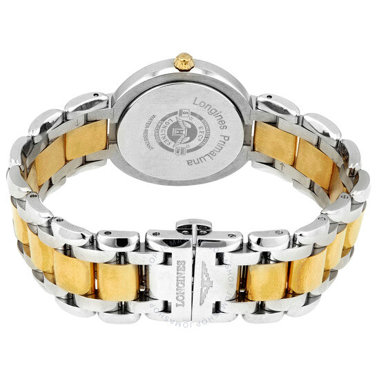 علبة من الفولاذ المقاوم للصدأ مع سوار من الفولاذ المقاوم للصدأ بوصلات مركزية من الذهب الأصفر عيار 18 قيراطًا. إطار ثابت من الفولاذ المقاوم للصدأ مع حلقة من الذهب الأصفر عيار 18 قيراطًا. ميناء فضي بعقارب زرقاء وعلامات ساعات بأرقام رومانية. علامات دقائق حول الحافة الخارجية. نوع الميناء: تناظري. عرض التاريخ عند موضع الساعة 3. حركة أوتوماتيكية من عيار L129. كريستال ياقوت مقاوم للخدش. تاج قابل للسحب/الدفع. غطاء خلفي صلب. شكل دائري. حجم العلبة: 30 مم. مشبك قابل للطي. مقاومة للماء حتى عمق 30 مترًا / 100 قدم. الوظائف: التاريخ، الساعة، الدقائق، الثواني. سلسلة بريمالونا. طراز ساعة رسمية. علامة الساعة: صناعة سويسرية. ساعة لونجين بريمالونا أوتوماتيكية نسائية بمينا فضي، L8.112.5.91.6.